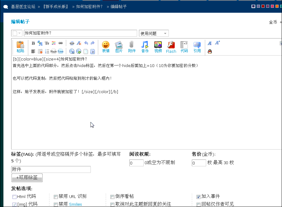 如何加密附件? 首先选中上面的代码部分,然后点击hide标签,然后在第一个hide后面加上=10(10为你要加密的分数) 也可以把代码复制,然后把代码粘贴到刚才的输入框内! 这样,贴子发表后,附件就被加密了! ... 阅读全文>