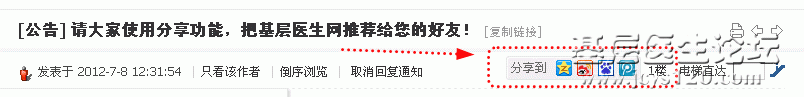 各位基层医生网会员朋友,您们好,为了扩大基层医生网的影响力,让更多的基层同行了解并且加入到基层医生网的讨论中来,我们在首页加了百度的分享功能,打开首页www.jcys120.com,页面右侧有悬浮按钮,点击即可方便 ... 阅读全文>