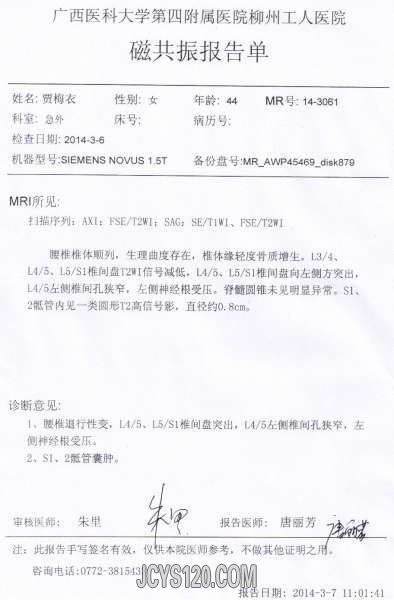 各位同仁,老师,这种病用什么方法治疗理想一些呢?手术吗还不必要。反复腰痛,双下肢睡时翻身有时有麻木感约一致两分钟症状有一年多时间,站立及挑东西没有什么不适,附磁共振报告单入下。 阅读全文>