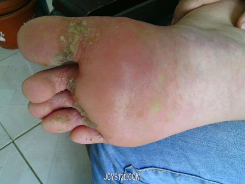患者男27岁,双足跖深在性水疱 足趾脓疱,渗液,发病三天, 大家讨论下: 1.足癣 2.汗疱疹 3.剥脱性角质松解 4.掌跖脓疱病 阅读全文>