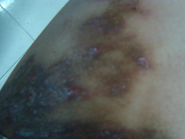 今天来诊,见如下图。刚开始呈烫伤样水泡,现已破溃。无痛无痒。 大家说说此为何病?该如何治疗? 非常抱歉,论坛暂时不能发表此类敏感图片,希望谅解!————jcys120 阅读全文>