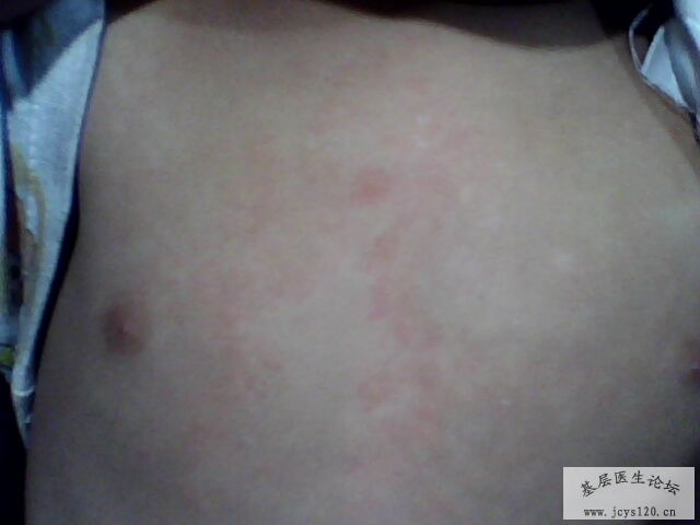 大家帮我看看知道小儿容易张什么疹子,一开始是胸部长了一个白色的斑点,在斑点的周边排列着许多泛红的皮疹,白色斑点脱屑不明显,我一开始按花斑癣治疗,给予克霉唑外用,效果不佳,前天复诊,见到颈部,腕部长了许 ... 阅读全文>