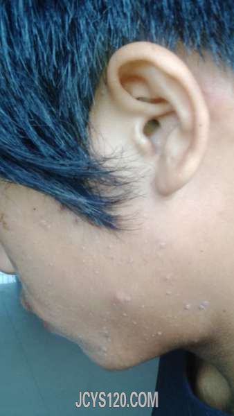 男,16岁,头面部起灰白色丘疹半年。患者半年前在左脸耳前起一个灰白色丘疹,开始为一个小点,后来增大至绿豆大,附近也长出类似的丘疹,扩散到额头部。丘疹为皮样增生,较软,类似于将要好的水痘,高出皮肤 ... 阅读全文>
