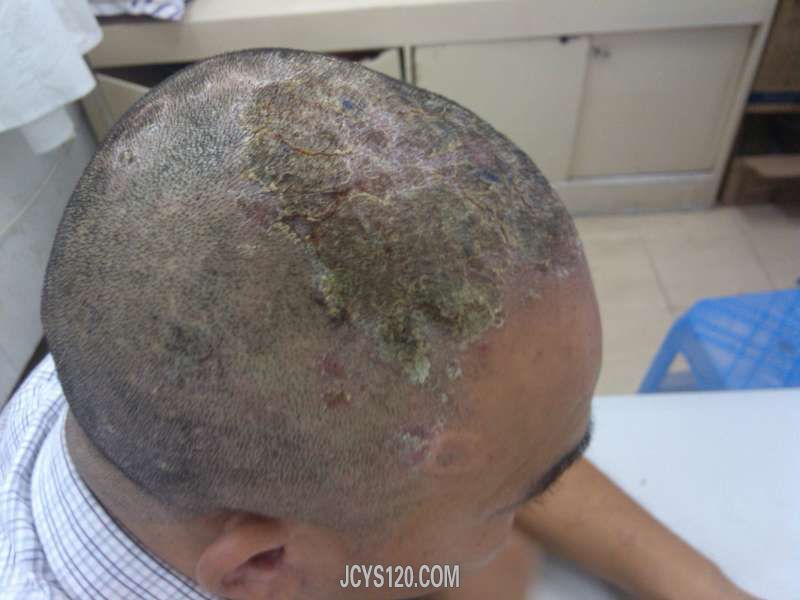 患者头部长疮流脓1个多月,于多家诊所求诊地无果。症状见图,头顶部及双耳可见脓痂,未及脓包。现拟诊:1.头部脓癣?2.头部脓肿性穿着性周围炎?治疗方案:头曲3.0+左氧0.4静滴,兰美抒口服,采乐洗头每天1次。现求 ... 阅读全文>