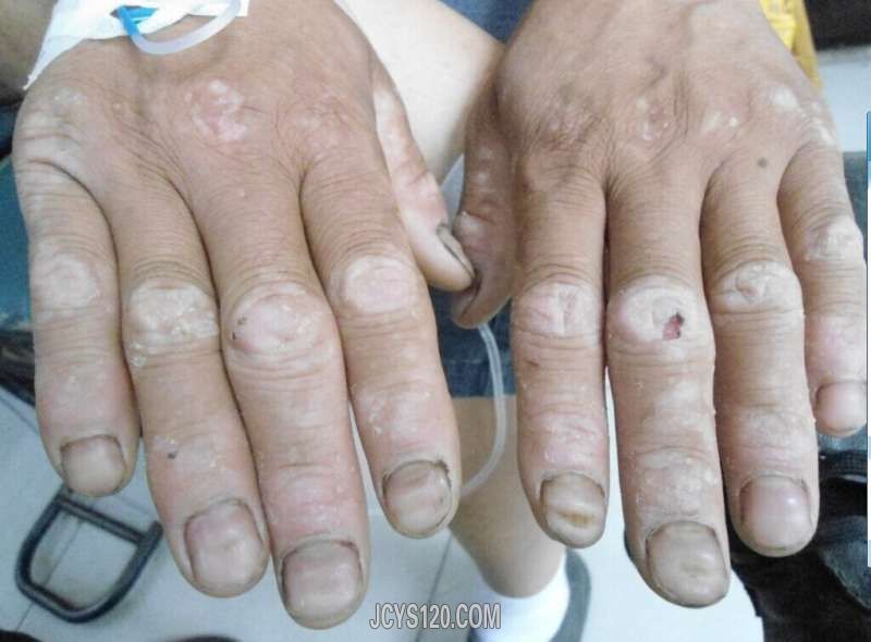 女,23岁。患此病三年,双手对称出现,有色素脱失现象,最近出现溃烂,但不痛不痒,请帮忙看看是什么??谢谢! 阅读全文>