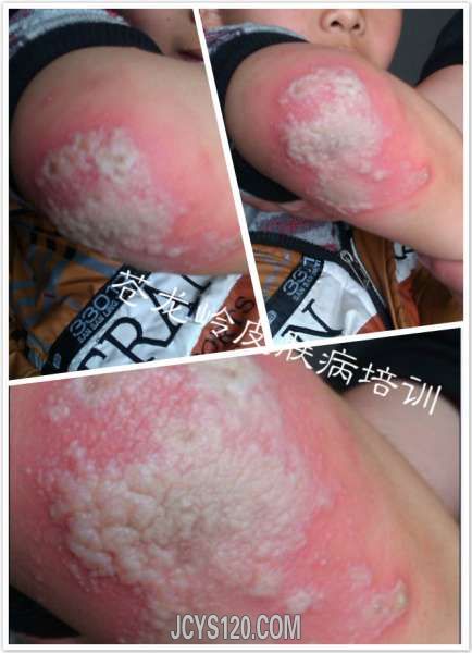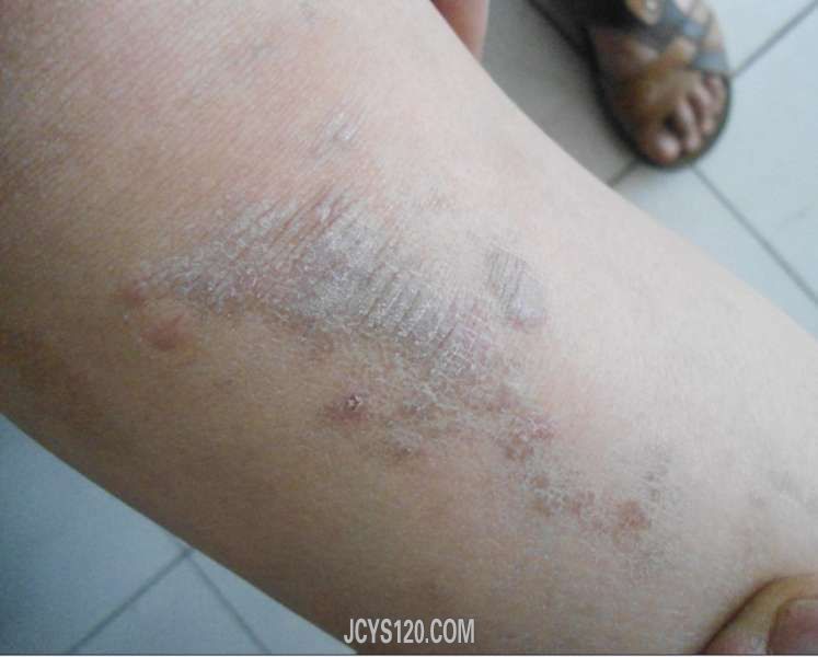 男,10岁,两月前右腿前侧出现皮疹伴瘙痒,皮疹形状不详,在某诊所治疗效果差,今来诊,观察:“右腿发病,皮疹大小不等,增厚,色微暗紫,条状分布,痒。看图,请老师帮忙下诊断及治疗方案! 阅读全文>