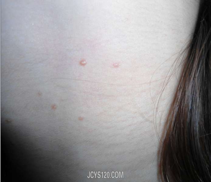 女,25岁,身体出现丘疹3个月,如图,自述刚开始在前胸出现痒疹,而后手臂和下腹也出现类似皮疹,痒,观察发现状如扁平有疣,又像传染软疣,但是没有传染疣突出,像真菌毛囊炎但不密集,抓破后有白色物质,请老师看 ... 阅读全文>