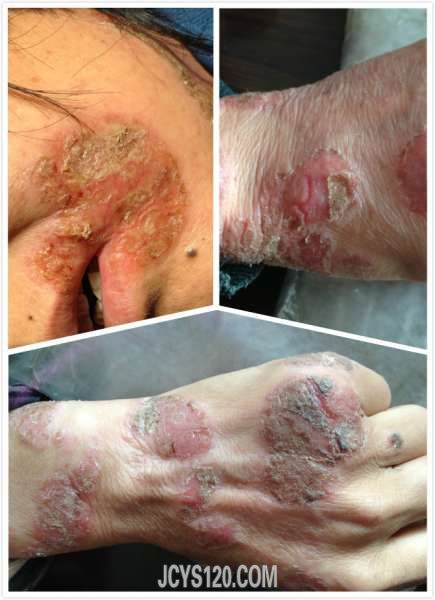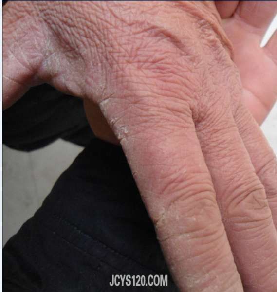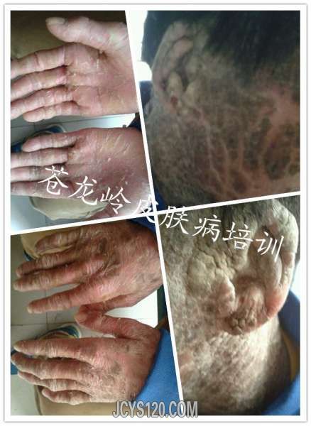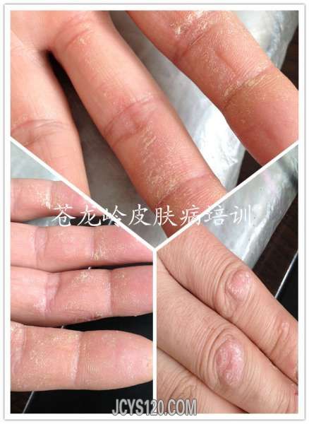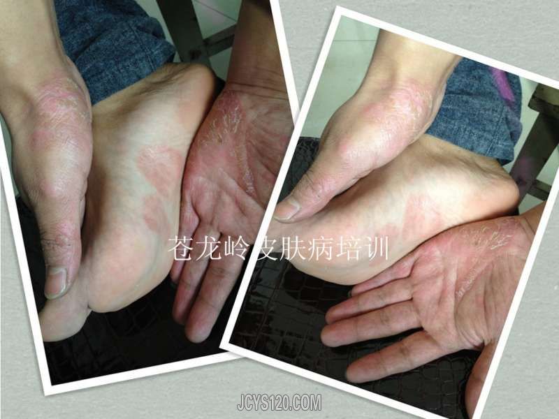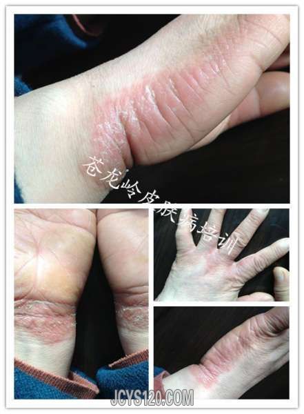 患者男26岁,工人,三年前双手掌片状皲裂,曾在外院诊断为“湿疹,掌跖角化病,皲裂性湿疹,手癣等”按照诊断用药,效果不佳,最好时仅仅不裂口,但是原始皮损犹存,昨个来我门诊,经过检查,最后诊断为。。。。。 ... 阅读全文>