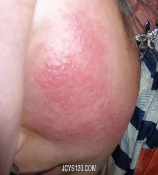 女,13岁,两天前出现颜面一侧红疹,微痒,微疼,无发热感冒,无外涂药物史,看图,考虑什么病? 阅读全文>