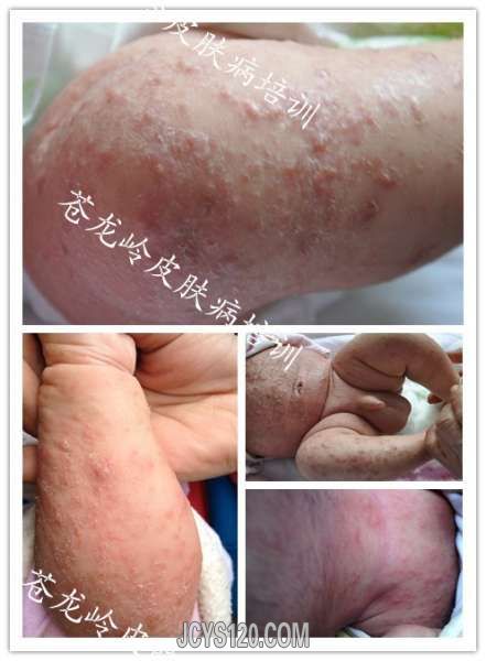患者 男 70天,全身红斑丘疹,轻度渗出4天,曾按照过敏给予药膏外用,效果不显, 患儿皮疹密集,红斑丘疹,少许水疱,下肢较重,详细询问,其母叙述自己周身瘙痒多日,仔细查体发现指缝,腹部见米粒大小丘疹,少许 ... 阅读全文>