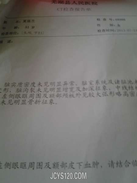 患者,女性,52岁,颅脑外伤半小时, 今晨两人骑电瓶车互撞,致其头部倒地,短暂意识丧失,稍感头痛,呕心,未吐,全身多处软组织损伤。 体检神清,痛苦貌,意识清楚,查体合作,头颅左侧上眼眶和颞部见8×6cm一个 ... 阅读全文>
