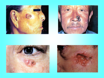 ]皮肤基底细胞癌 在基层治疗活动中 我们经常碰到老年人头面部有一个黑色或色素沉着的肿块,边界清楚,上面有乳头突起或溃烂。这就是皮肤基底细胞癌。下面我就此病向大家简单介绍一下。 基底细胞癌多见于老年人,癌 ... 阅读全文>