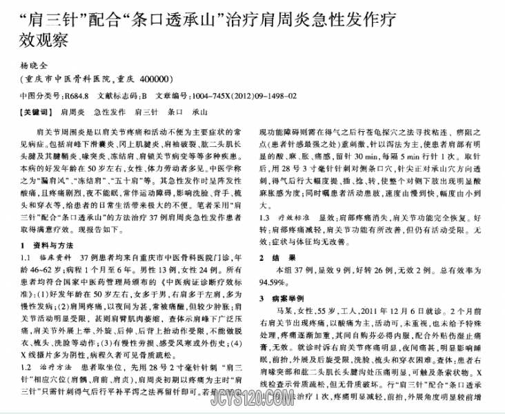 “肩三针”配合“条口透承山”治疗肩周炎急性发作疗效观察 “肩三针”配合“条口透承山”治疗肩周炎急性发作疗效观察 浅谈肩三针 在临床上治疗肩周炎常运用肩三针为主要的穴位而其中肩骨禺,肩髎分别为手阳明大 ... 阅读全文>