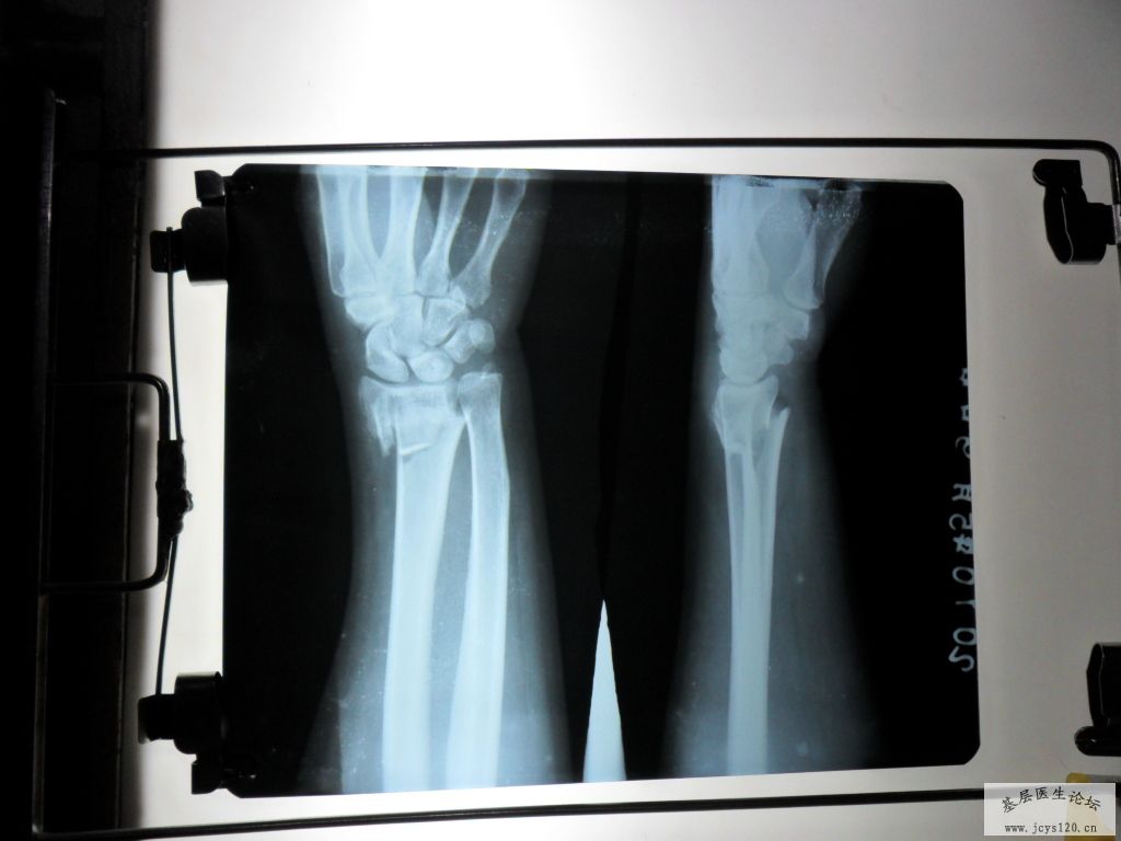 一小时前,有一妇女因为去田间放水,不慎摔倒在田埂上,摔倒时因害怕伤着头,条件反射式的将右手撑在地上,右手剧烈疼痛,所以来诊,给予急诊X光摄片,呈右手远端粉碎性骨折,断端重叠移位,并有小块碎骨片嵌插在断 ... 阅读全文>