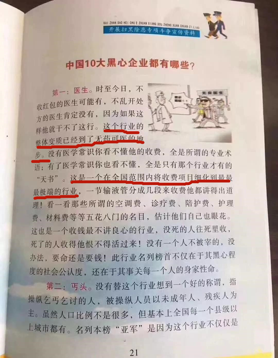 “宣传资料照抄不当内容,镇相关负责人未严格履行审核把关职责”,这是渭塘镇给出的检查。我们暂不说当地政府的官员渎职,这个宣传资料抄自哪里,为什么会有这样的资料可抄?但可以肯定地说我们的社会出了问题,这类事件已经不是第一次了。2018年,河北省小学五年级下册教辅材料中一道涉嫌贬损医务人员或医务工作的题目被曝光。内容为:“有些医院总是打着专业的旗号,但是从医生素质、从业经验等方面来看,破zhan( )比比jie( )是,所以患者一定要注意。”虽然事后出版社道歉了,但是这些年来对医生形象的抹黑,让不信任医生的思想根植于儿童心中,这样的伤害又怎是一句“对不起”就能弥补得回来? 如果照“宣传资料”的内容定义,医生这个群体是一个“黑心企业”,是“扫黑除恶之首”,那么医生这个“首恶”到底是一个怎样的群体?