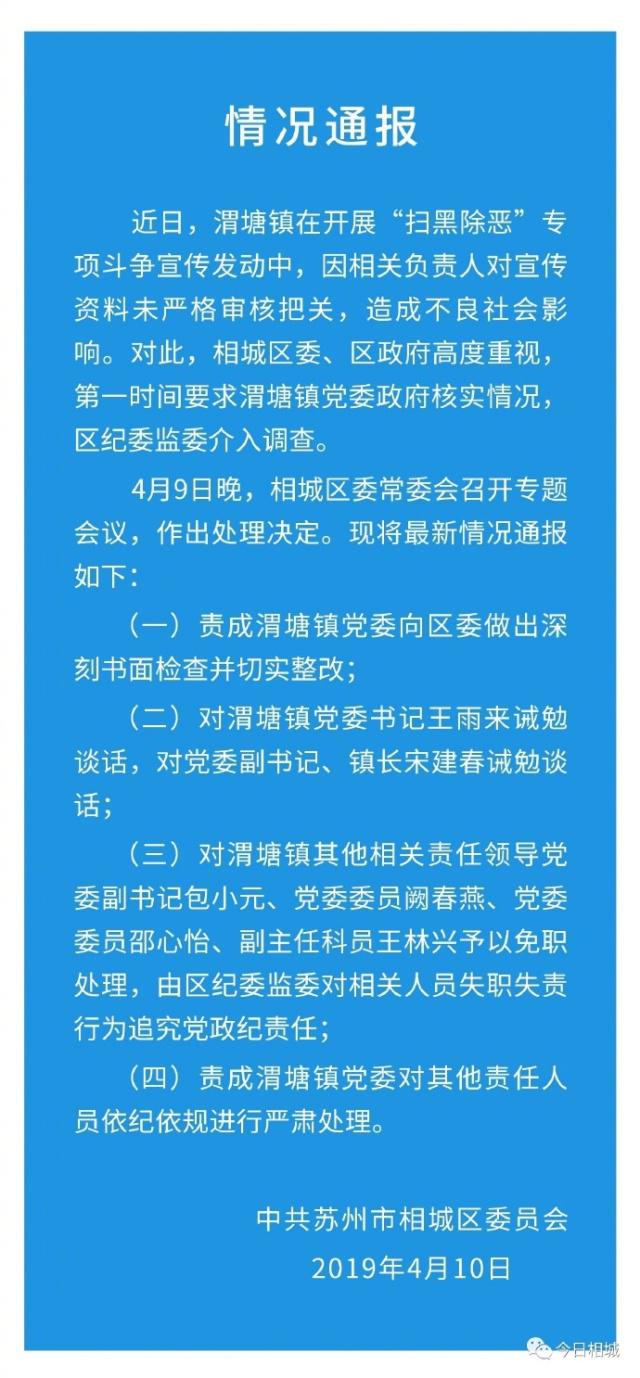 10日晨,中共苏州市相城区委员会发布情况通报,对相关责任人做出处理决定。责成渭塘镇党委向区委做出深刻书面检查并切实整改,对渭塘镇党委书记王雨来诫勉谈话,对党委副书记、镇长宋建春诫勉谈话。