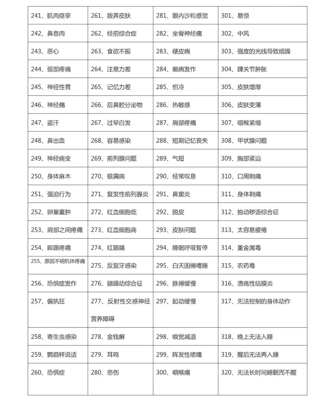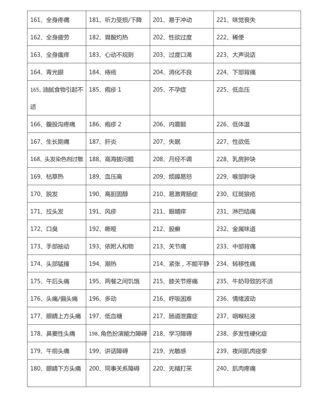 请阅读下面几页里的症状表。他们可能由过敏引起。数以千计的人接受NAET治疗而从这些症状中得到了解脱。 请用0-5等级评定你的症状: 0=没有症状; 1=轻度症状; 2=中度症状; 3=严重症状; 4=极重度症状; 5=接近死亡。 过敏症状自评
