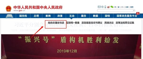 登录中国政府网(www.gov.cn),选择菜单里“互动”栏目下的“我向总理说句话”,即可写下您想说的话。