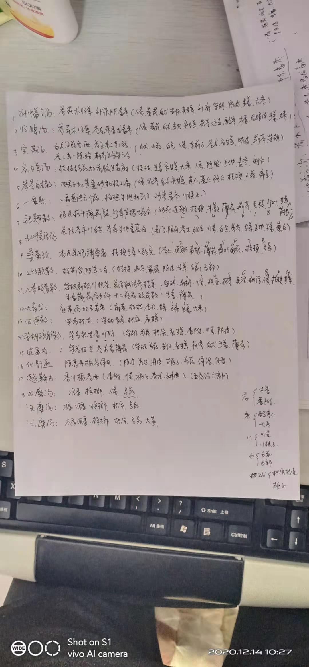 我不知道别人说过没有,但我是说过的,一个方子在你心里有多重要,你内心理论有多深刻,才能对病情分析越接近真像。 下面这些方子是我相对来说认为很重要的。 写贴贯例,先写方名,再默写方药,在我的认知水平内加以阐述和对比。 补中益气汤:参芪术归草,升柴陈姜枣。(人参,黄芪,白术,当归,炙甘草,升麻,柴胡,陈皮,生姜,大枣) 这个方子我很重视的哦,伤寒论以桂枝汤为首,汤头歌以四君子汤为首,我觉得这个方子也很重要,他每个医生写的书,把谁排头,不是随意的,我们要细细体会他想要传达的意思才好。这个方子我们可以看一看,当归补血汤是什么,不是黄芪和当归么,且比例为5比1,补血益气健脾理气,多好呀。 归脾汤:参芪术归草,苓志枣香龙姜枣。(人参,黄芪,白术,当归,炙甘草,茯苓,远志,酸枣仁,木香,龙眼肉,生姜,大枣) 这个也很重要,看看它和前方的区别,都有参芪术归草,本方是治疗心脾两(阴)虚的症状的,像心烦不安,失眠多梦等都应该有很好的疗效的。我忽然想到了和酸枣仁汤的区别:酸枣甘草川知苓(酸枣仁,炙甘草,川芎,知母,茯苓)(我的这些口诀里,川zhi苓太多的,有枳实的枳,有栀的栀,有知母的知,得详细分辨一下才好使哦)。可以看看两方的区别,前者有:人参,黄芪,白术,当归,远志,木香,龙眼肉,生姜,大枣。后都有川芎,知母。共有酸枣仁,茯苓,炙甘草)。一个有川芎,有个有当归。而当归和川芎,又名佛手散,是治疗妇女痛经的经典方药。我们不得不细细体会区别,后面的逍遥丸和柴胡疏肝散也是这样的,一个有当归,一个有川芎。 完带汤:白术山药各一两,芍五参二车三钱,苍三草一陈五分,荆芥五分柴六分。(白术,山药,白芍,人参,车前子,苍术,炙甘草,陈皮,荆芥,柴胡) 这个方子我也很重视。是治疗妇女带下病的底方,我认为的。来源于傅青主的书。很好的,我连剂量都背上,妇女的带下病,无非与肝脾肾三脏关系最亲密。这个方子,柴胡和陈皮,轻轻疏肝,重点以白术,山药,健脾化湿,湿去何来带下呢。其它各色带下病,都应以这个为底方,随症加减 ,我觉得效果应该不错哦。 参苓白术散:四君子加莲薏砂和桔山扁。(人参,茯苓,白术,炙甘草,莲子仁,薏苡仁,桔梗,山药,扁豆) 这个方子是我的核心,也是重中之重,可以看下我前面的贴子,我基本就会一个参苓白术散,它来源于四君子(人参,茯苓,白术,炙甘草,看看本方方名不就是参苓白术散吗),四君子名列汤头歌之首。加减也很多哦,加陈皮,半夏,就是六君子汤,再加木香和砂仁就是香砂六君子汤,六君子去半夏又名异功散。 再看看里面的方药,陈皮,半夏,茯苓,甘草。这四药方名为二陈汤,二陈汤是治疗痰饮症的基本方。二陈汤又是减肥的底方,因为胖人多湿,湿不去何以减肥,这样大家都应该熟悉些吧。所以我一般很爱用参苓白术散,尤其是儿科,小儿的疾病本来没什么杂病,阳长有余,阴长不足,健脾化湿,填补骨髓(可以用六味地黄丸呀,别以为是男人的药,它制方本意就来源于儿科的哦)是核心要义呀,但儿科还有一个特点就是病情转化迅速,这点我们一定要注意。 一贯煎:一贯煎用六个药,枸杞生地和当归,沙参麦冬川楝子。(枸杞,生地,当归,沙参,麦冬,川楝子) 这个没什么想说的,只不过背到这儿来,就拿来背一下。枸杞,生发,沙参,麦冬,滋阴润燥,当归补血,很明显就能看出来它的适应证的,肺阴虚咳嗽也能用呀。说到这里,完了看看和沙参麦冬汤的区别,和清金化痰汤的区别。 银翘散:银连桔牛薄荆豉,竹草芦根十药全。(银花,连翘,桔梗,牛蒡子,薄荷,淡豆豉,竹叶,炙甘草,芦根) 这又是一张名方,只不过是现在非常常用罢了。一切温热病症初期,都选用的是银翘散的。重不重要,自己看吧,我们有必要把它记住喽。 九味羌活汤:羌防苍辛白芷,芩草生地姜葱白。(羌活,防风,苍术,细辛,白芷,黄芩,生地,生姜,葱白) 这个方子应该是时方的代表吧,最常听的这个还是人参败毒散,还有荆防败毒散。后面有,到了再说。 这里有一个方子得说一下,那就是防风,黄芪,白术,这三药又名玉屏风。也很重要哦。 桑菊饮:杏连苇根薄桑菊,桔梗甘草八药完。(杏仁,连翘,苇根,薄荷,桑叶,菊花,桔梗,炙甘草) 这个也不想多说了,嗓子难受,咽咳不爽,肺部燥咳都可用的,想想伤寒论里的桔梗甘草汤,苦酒汤,不都是治疗咽部不爽的病症的吗,有伤寒的影子哦。 止嗽散:桔荆紫陈草二白。(桔梗,荆芥,紫苑,陈皮,炙甘草,白前,百部) 还是桔梗甘草汤的影子,再加荆芥以祛风,陈皮理气,紫苑,百部以润肺,(分析的不太准,因对白前,百部等不是太熟悉) 人参败毒散:柴胡前胡川枳苓,羌活独活参桔草,生姜薄荷各少许,十二药成败毒散。(柴胡,前胡,川芎,枳壳,茯苓,羌活,独活,人参,桔梗,炙甘草,生姜,薄荷) 这个方子得好好说道说道了,有一口诀:虚人感冒败毒散么。看看就是这些成份了。看看它和荆防败毒散的区别 荆防败毒散:柴胡前胡川枳苓,羌活独活(荆芥,防风)桔草,(不要生姜了)薄荷少许,就是荆防败毒散(柴胡,前胡,川芎,枳壳,茯苓,羌活,独活,荆芥,防风,桔梗,炙甘草,薄荷少许组成荆防败毒散。 后面还有一个参苏饮。和这个的区别。 我也不知道为什么,据说这些方子是因为伤寒论的方药条理太明确,一般人不好分辨,所以才有了这些所谓的万能方药,就是感冒不用分辨的那么清楚,基本都管用。唉,不知道怎么想的哦。一个伤寒论七十多个药,组成一百一十二个方子,都捋不清,何谈这些呢。(我