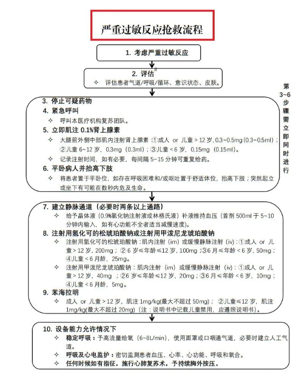 过敏反应、严重过敏反应、肾上腺素、氢化可的松、甲泼尼龙、苯海拉明#a. 若患者诉头皮瘙痒、脚心、手心瘙痒,这些往往是严重过敏反应的前驱症状,这种情况,护士应抽好肾上腺素备用。b. 危及生命的临床表现如下:①呼吸:呼吸频率增快、SpO2<92%、喘息、声音嘶哑、紫绀等;②循环:苍白、四肢厥冷、心率明显增快、血压下降等;③中枢神经系统症状:头晕、眼花、乏力、神志淡漠或烦躁不安、昏迷直至抽搐、大小便失禁;④荨麻疹。参考文献:关于印发四川省围手术期预防性应用抗菌药物实施细则(2023版)的通知. 四川省药事管理质量控制中心. 2023-4-27.