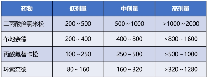 注:表中水盐代谢、糖代谢、抗炎作用的比值均以氢化可的松为 1 计;等效剂量以氢化可的松为标准计 表2:呼吸科常用吸入型糖皮质激素的日剂量(ug)