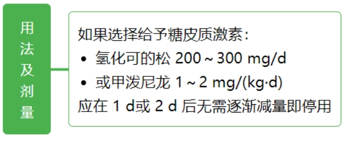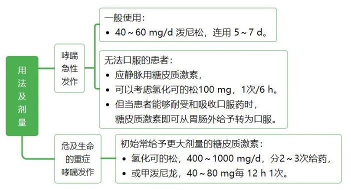 糖皮质激素常用剂量选择 常用剂量一般分为小剂量、中剂量、大剂量、超大剂量和冲击剂量。 小剂量:相当于泼尼松15mg/d以下。激素占据糖皮质激素受体的50%以下,完全通过基因效应发挥作用而不良反应趋于零。多用于自身免疫性疾病、器官移植的维持治疗或肾上腺皮质功能减退症的替代疗法。 中剂量:相当于泼尼松15~30mg/d-。激素占据糖皮质激素受体的50%~100%,基因效应呈显著的剂量依赖性,不良反应也随剂量与时间的增长而加大。大多数自身免疫性疾病、血液病和过敏性疾病的起始治疗剂量都会选择中剂量。 大剂量:相当于泼尼松30~100mg/d-。由于激素受体的饱和度增加,剂量依赖性越来越小,当达到100mg/d时几乎全部受体都被结合, 糖皮质激素的基因效应达到最大值。但大剂量应用激素不良反应严重,不能长期使用。重症自身免疫性疾病、急性重症感染、肾上腺危象、急性过敏反应和器官移植起始剂量,经常中、短期应用大剂量激素。 超大剂量:相当于泼尼松剂量>100mg/d-。激素与激素受体全部结合,增加剂量后通过非基因效应增加疗效。因为对血糖、血压等生理指标影响巨大,只能短期应用。 冲击治疗:相当于泼尼松剂量>500mg/d-。一般为静脉给药,多为甲泼尼龙1g/d-,连用3~5d后减量至1mg/kg/-d-。非基因效应可能起更大作用,应特别注意严格掌握适应证,避免引起感染、高血压、高血糖和类固醇性肌炎等不良反应。 不同疾病选用不同剂量。下面主要介绍糖皮质激素在呼吸科常见急症中的用药建议、剂量与用法。不要怪小编偏心哦!就是偏心咱呼吸科医生。 1、 慢性阻塞性肺疾病急性加重(AECOPD) 建议:推荐所有 AECOPD 患者接受全身性糖皮质激素治疗。 用法及剂量: 泼尼松 40 ~ 60 mg 1 次/d,治疗持续时间为 5 ~ 7 d。 疗程结束时,如果患者已明显恢复,则可直接停用糖皮质激素,而不是逐渐减量至停药。 2、过敏性哮喘急性发作 建议:急性发作时应先给予吸入短效 β 受体激动剂(SABA),如不能完全缓解、症状持续,应开始给予糖皮质激素。 用法及剂量: 吸入型糖皮质激素—大幅增加吸入型糖皮质激素的剂量,急性发作期可以 2 ~ 4 h 给予 1 次。但哮喘急性发作时,吸入型糖皮质激素的剂量加倍往往不能有效替代口服糖皮质激素。 全身性使用糖皮质激素:推荐对需要急诊处理的哮喘急性发作患者尽早全身性使用糖皮质激素: