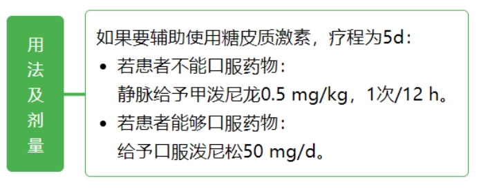 提醒:初始超大剂量(例如,甲泼尼龙 500 mg 快速静脉给予)并不比初始大剂量(125 mg)更有效。几乎所有需急诊重症哮喘发作都要序贯使用 5 ~ 10 d 的口服糖皮质激素。大多数重度发作需要 10 ~ 14 d 缓解(肺功能恢复至基线)。 3、普通成人社区获得性肺炎(CAP) 建议:糖皮质激素用于 CAP 辅助治疗尚有争议。如果有证据表明 CAP 患者的宿主炎症反应过度或失调,建议辅助使用糖皮质激素。这些证据定义为脓毒症或需要 FiO2 > 50% 的呼吸衰竭伴 ≥ 1 项以下特征:代谢性酸中毒(动脉血 pH 值 < 7.3)、乳酸 > 4 mmol/L、C 反应蛋白 > 150 mg/L。这些患者的死亡风险高,很可能获益。 若已知 CAP 患者由流感病毒或真菌(如曲真菌)引起,使用糖皮质激素应该慎重。糖皮质激素应该避免用于有重度不良事件危险因素的 CAP 患者,例如近期消化道出血者、糖尿病控制不良者,或重度免疫功能受损者。